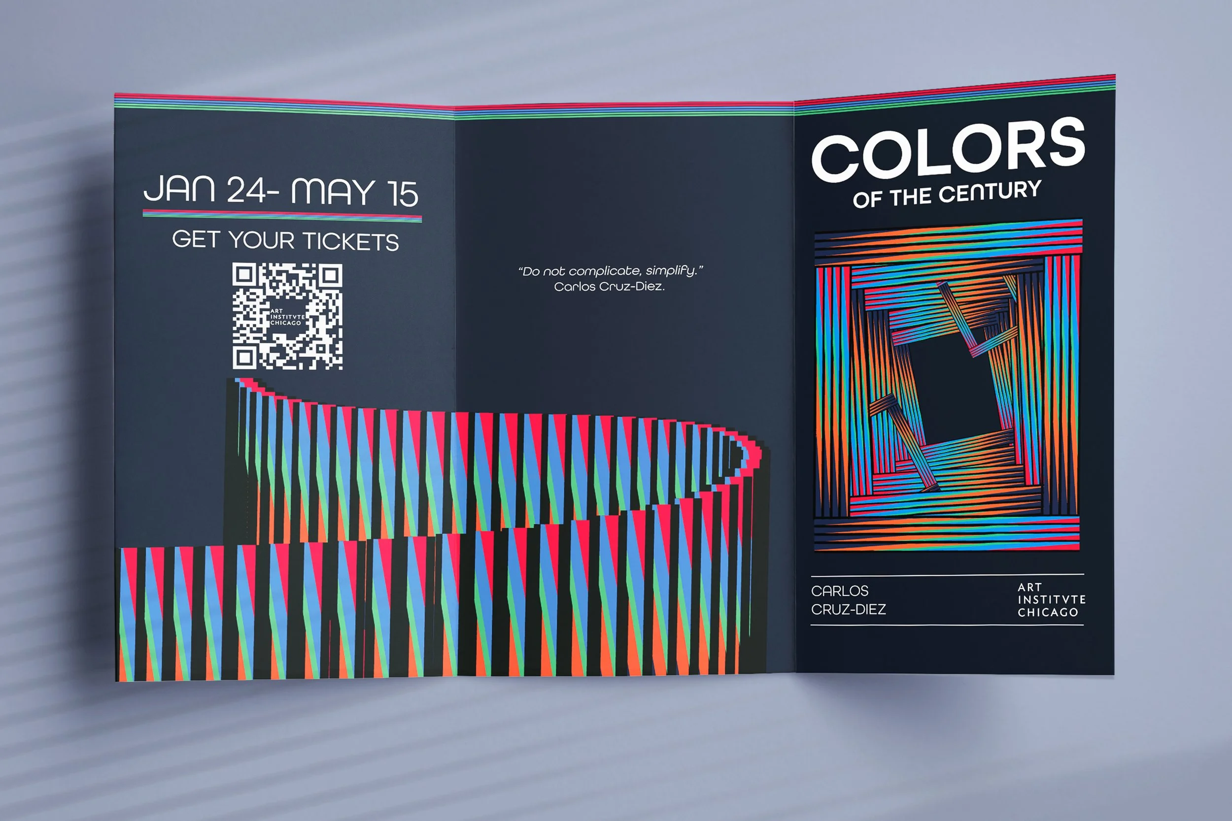 For my Graphic Design II class, students were tasked with creating promotional materials for an art exhibition featuring an artist of our choice. I chose to focus on the work of Carlos Cruz-Diez, whose paintings often feature repeated, colorful, and dynamic lines that interact to create the illusion of movement.