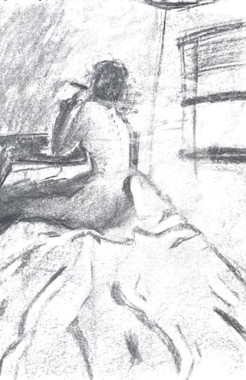 ‘Untitled’ is a hand-drawn self-portrait in charcoal, focusing on vulnerability and introspection. With my back turned to the viewer and wearing no clothes, only the dot tattoos down my spine are visible. The soft, gritty shading and subtle sunrays and wrinkles on the blanket enhance the intimate, reflective atmosphere.