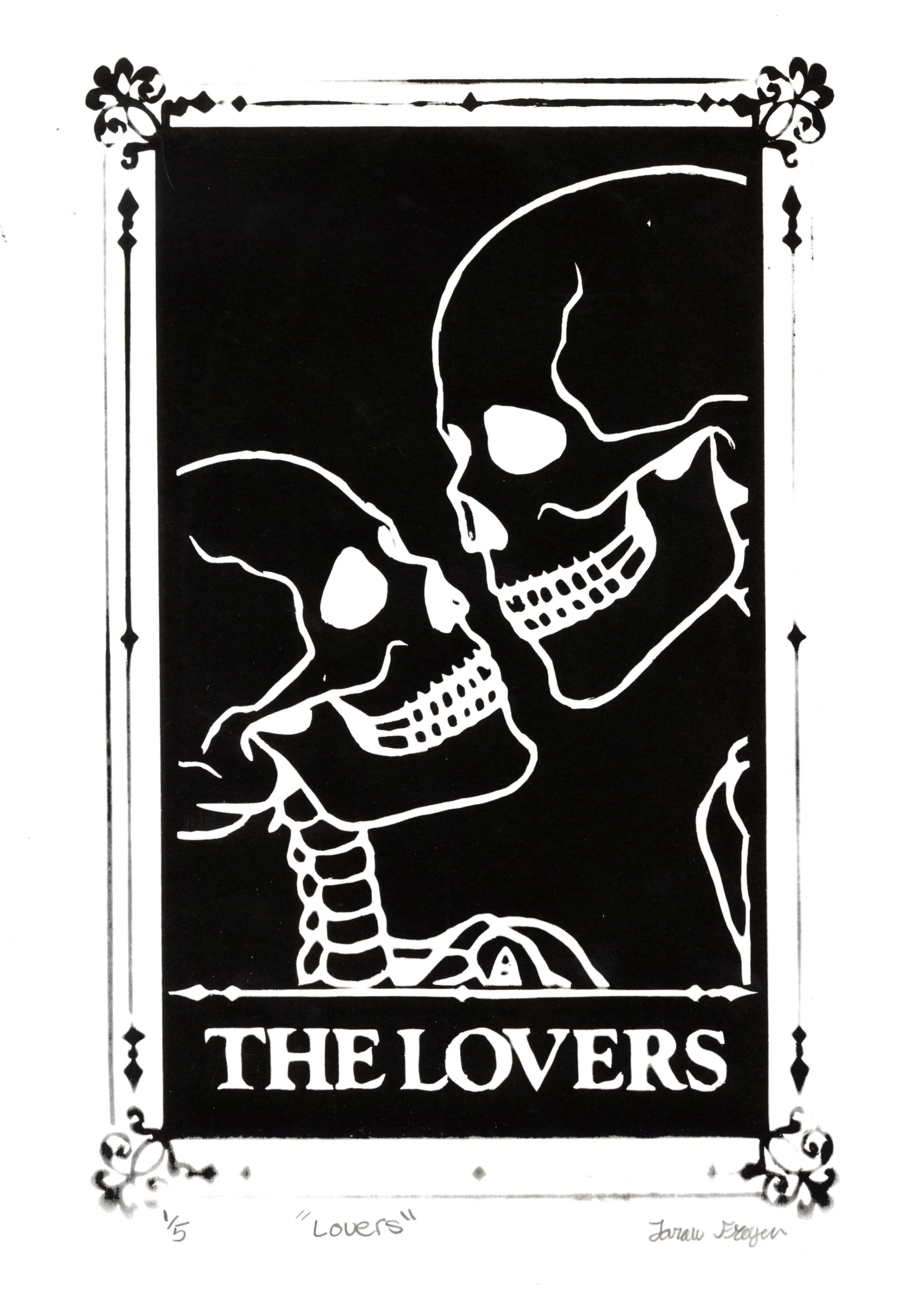 Projects from my silkscreening class. My own interpretation of the tarot card ‘the lovers’, hand-carved in ruby lith. An x-ray of a corset on damaged ribs that I digitally manipulated and screen printed. A digitally manipulated image of a butterfly, printed through screen printing.